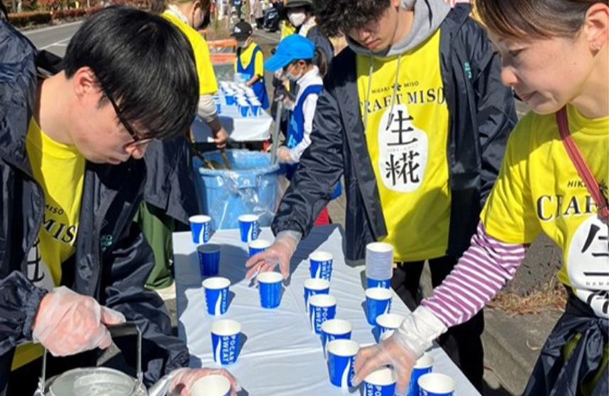 当社は、地域社会の一員として、地域の皆さまとのコミュニケーションを大切に考えています。コミュニケーションの機会として、本社のある諏訪郡下諏訪町と飯島グリーン工場のある上伊那郡飯島町にて、年に2回、特別販売会を開催しています。地元の皆さまに日頃の感謝の気持ちをお伝えするだけでなく、普段は工場で味噌づくりに従事する職人が、味噌の特長や楽しみ方を紹介し、地域の特産物である味噌の魅力を知ってもらえるような交流を目指しています。また、飯島グリーン工場の近隣、中央アルプスの麓で開催される信州駒ケ根ハーフマラソン大会は、第一回の2014年大会より、一時休止前の2025年大会まで継続的に支援を行いました。 ひかり味噌󠄀本社がある長野県諏訪市の諏訪湖畔で行われる諏訪湖マラソン大会にも支援およびランナーや、給水ボランティアとしても参加し、参加者の皆さまとコミュニケーションを図るとともにイベントの開催を応援しています。