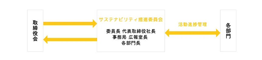 代表取締役社長を委員長、広報室長を事務局とした「サステナビリティ推進委員会」を設置して、各部門と横断的な対応を協議しサステナビリティ活動を推進します。
