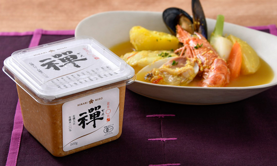 さらに、スープをおいしく仕上げる役割を果たすのが、「銀座豉特選 禅」。 12割麹と米麹をふんだんに使い、短期発酵そして長期冷温熟成でつくられているこの味噌は、うまみを確保しながらもさらりとした甘みが特長です。 「魚介のうまみ成分であるコハク酸とイノシン酸に味噌のグルタミン酸が加わり、うまみの相乗効果によって、よりおいしさを感じられます。 比較的、色が淡く、塩味が控えめな『禅』は、サフランの鮮やかな黄色を邪魔せず、見た目にも美しいスープにしてくれます」 番紅花(ばんこうか)といわれ、婦人病を和らげる生薬とされるサフランには、体を温める効果や華やかな香りがあるので、 おもてなし料理におすすめだという堀先生。年末の食卓に、ぜひトライしたい一品です。
